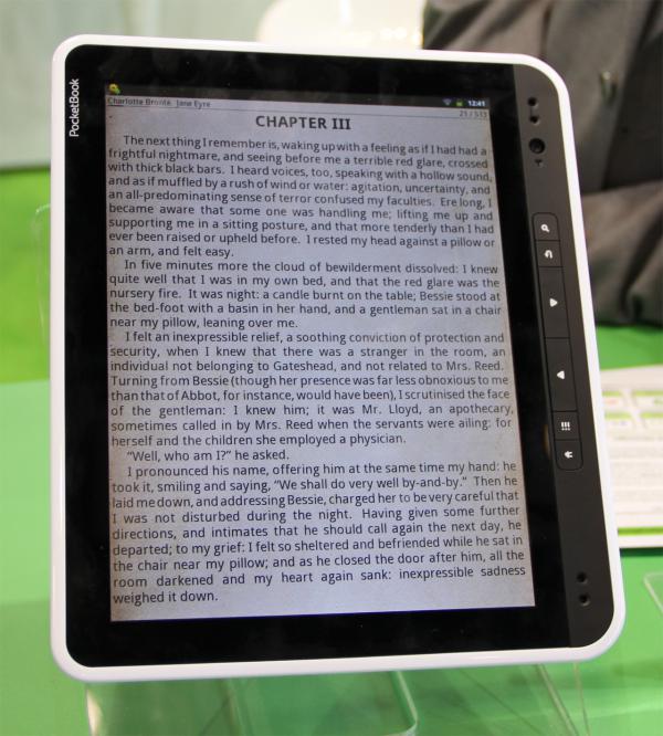 Довольно легкий, ухватистый. Кроме обычных андроидных кнопок снабжен кнопками листания страниц. "Андроид" внутри - к сожалению, 2.3.4, а не третий. В PocketBook это объясняют тем, что они сделали свое приложение для чтения (виджет виден на скриншоте), а под третий "Андроид" это все очень долго согласовывать.