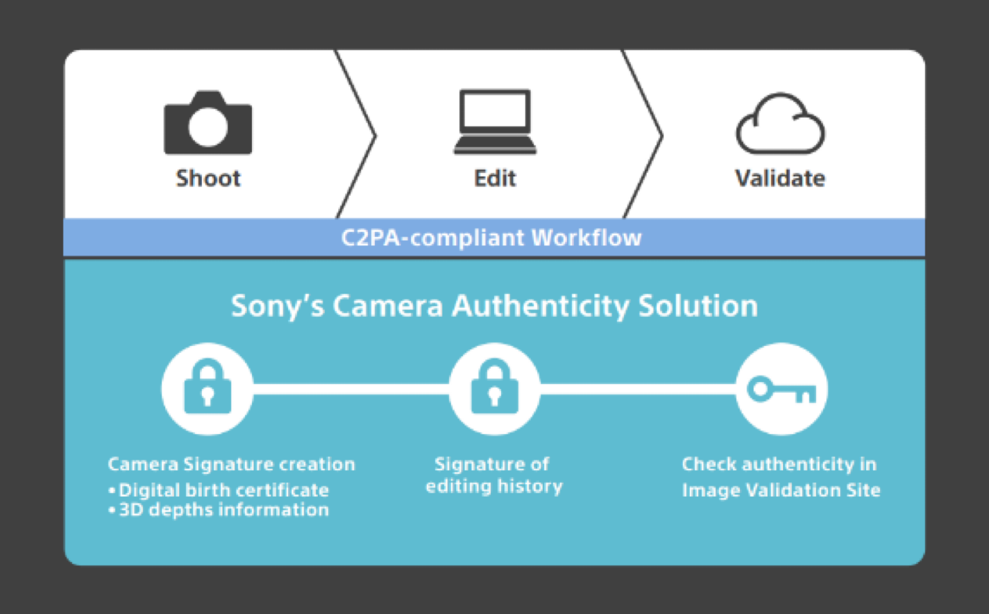 ...The update contains some of Sony’s most impactful technology, including Camera Authenticity Solution, the proprietary in-camera digital signature and C2PA (Coalition for Content Provenance and Authenticity) format support1. Together, these tools will make it possible for news agencies to ensure the authenticity of images, contributing to industry efforts to protect creators, and society from fake imagery.