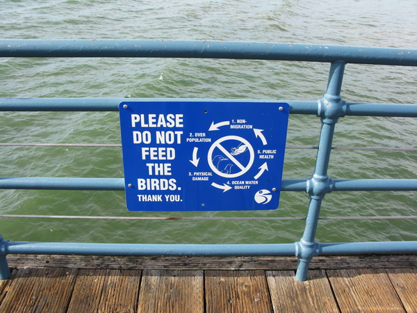 На пирсе строго требуют не кормить птичек. И объясняют, почему именно. Потому что кормите птичек - они ленятся на зиму улетать в теплые края. Ленятся улетать - появляется слишком много птичек. Птички получают повреждения и повреждают океан. И пьяным русским тогда становится опасно купаться.