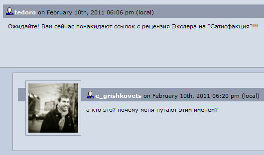 Гришковец, как умный человек, естественно знает кто такой Экслер. Но как Творец - ему, естественно, не с руки признаваться в том, что он опускается до каких-то там блоггеров, их мнения и вообще плебса, который не оценил и вообще посмел сравнивать его творения с квартетами-и и т.п. низкой и пошлой пародией на Искусство. То есть это ровно позиция Михалкова. Тому еще как-то простительно, Барин Всея Руси вхож в Высокие Баблодающие Кабинеты и интернет ему весь до фени, в т.ч. и по возрасту. А Гришковец вполне в курсе, просто бравирует своим "положением". Лукьяненко еще был - тоже мастер пера, обиделся на всех за нелестные отзывы и закрыл ЖЖ.