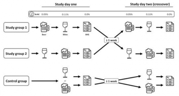 Короче говоря, участники исследований (90 участников в возрасте 19–40 лет (средний возраст 23,9 года), 50% из них женщины) были разделены на тройки и случайным образом распределены в соответствии с возрастом, полом, составом тела, привычками к употреблению алкоголя и частотой похмелья. Они употребляли алкогольные напитки до определенной концентрации спирта в крови, причем одна группа пила сначала пиво, потом вино, другая группа сначала вино, потом пиво, третья группа только вино, четвертая группа только пиво.