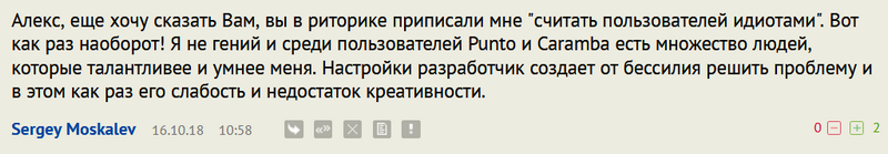 Я вполне допускаю, что многим пользователям Caramba не создает никаких проблем, но мне эта программа именно что создает проблемы, причем временами - совершенно неустранимые, что меня не устраивает категорически. Ну и сам подход разработчика меня тоже не устраивает. Потому что гибкие настройки позволяют настроить программу под предпочтения пользователя. А это ваше "жрите что дают" - не вариант вообще ни разу.