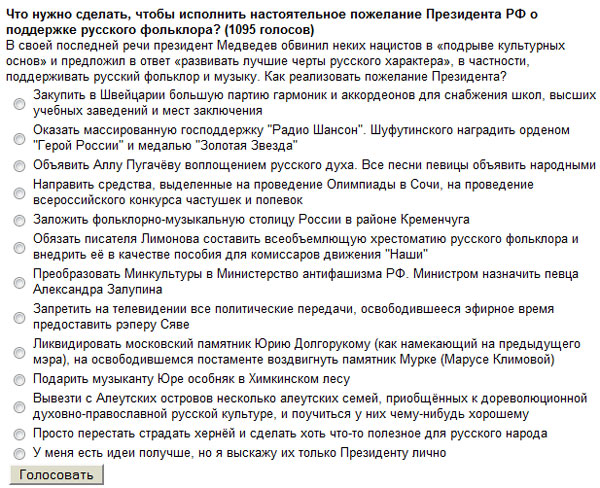 На сайте "АПН" проводят интересный опрос: "Что нужно сделать, чтобы исполнить настоятельное пожелание Президента РФ о поддержке русского фольклора?" Опрос на главной в самом низу, варианты ответов - впечатляют.