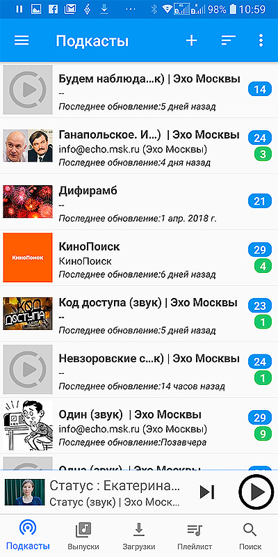 Меня окончательно достало приложение BeyondPod, которым я пользовался довольно долго, и я озаботился тем, чтобы найти себе более подходящую программу для прослушивания подкастов на смартфоне. Перебрал несколько вариантов, в результате остановился на Podcast Republic (есть только под Android). Бесплатное, вроде бы даже без рекламы, удобное и гибко настраиваемое.