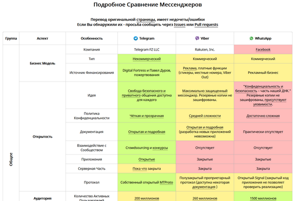 Собственно, сравниваются только Telegram, Viber и Whatsapp. Мне даже не столько интересно было сравнение посмотреть - понятно, что Telegram остальных уделывает практически по всем фронтам, - сколько почитать перечень того, что вообще мессенджеры умеют. Нашел для себя как минимум штук пять функций, о которых не имел ни малейшего понятия и которые теперь нужно будет потестировать.