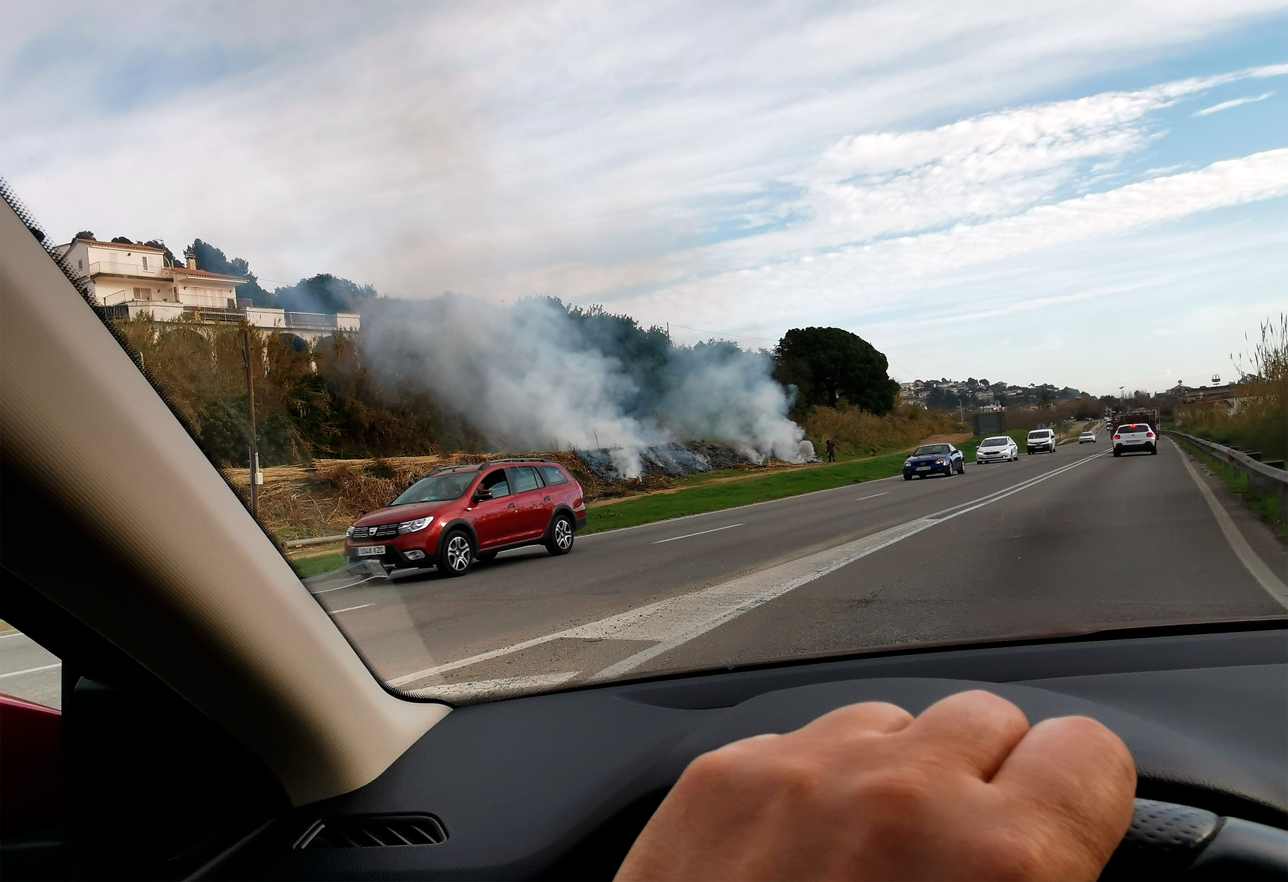 Подъезжаю ближе - ан нет, это немного дальше ресторана два гордых сына африканского народа палят траву. Я тут первый раз такое вижу за семь лет, думал, что в Испании этим крайне опасным и вредным для природы идиотизмом не страдают. Все-таки страдают. Правда, палят достаточно аккуратно, там над этим скосом асфальтовая дорога идет, так что огонь не перекинется, но все равно как-то стремно.