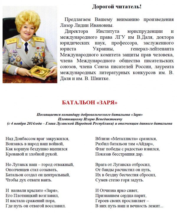 Я почему так и думал, что генерал-лейтенантша Международного комитета защиты прав человека (само по себе звучит невероятно прекрасно) должна примерно такие прекрасные стихи и писать, сумев стезю горя задуть. Международные литературные конкурсы, которых она стала лауреатом, наверняка проходили исключительно в государственном образовательном учреждении высшего профессионального образования «Луганский государственный университет имени Владимира Даля», где это опубликовано в "Университетском вестнике". Так еще и другие стихи генерал-лейтенанта Международного комитета есть.