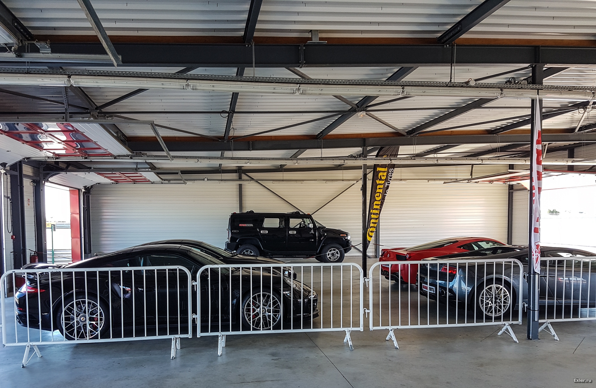 Прибыли в ангар. "Книги вас ждут", а именно - Ferrari, Lamborghini, Porsche и Aston Martin. Еще на заднем плане Hummer, но он чисто для ознакомительного круга по треку. (Да и на фиг он вообще сдался, если честно.)