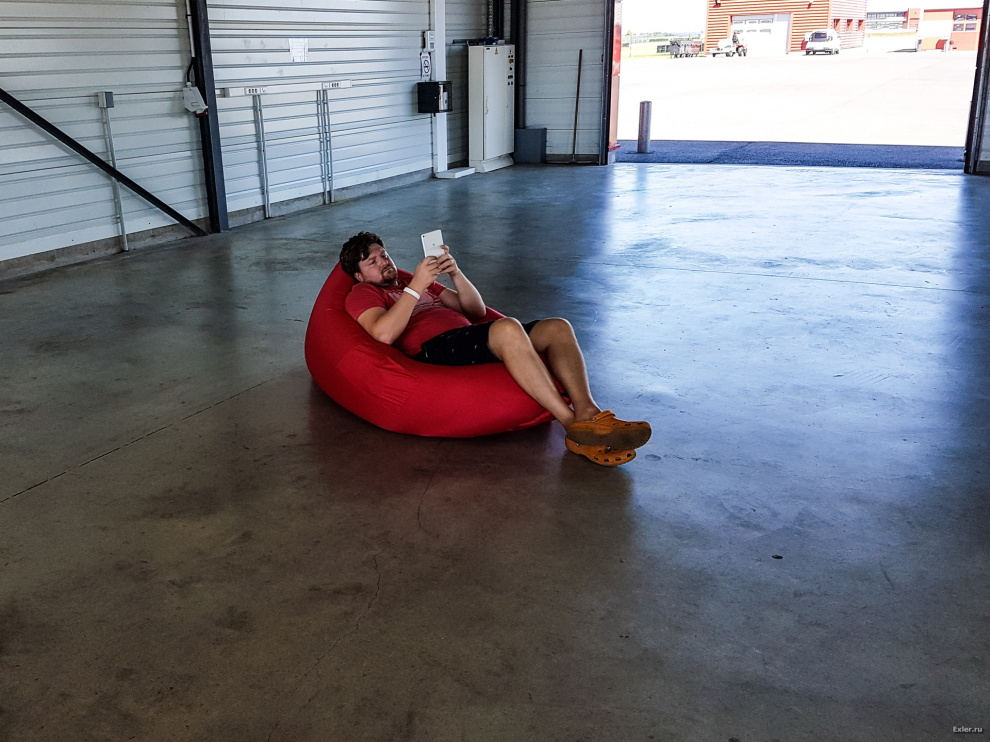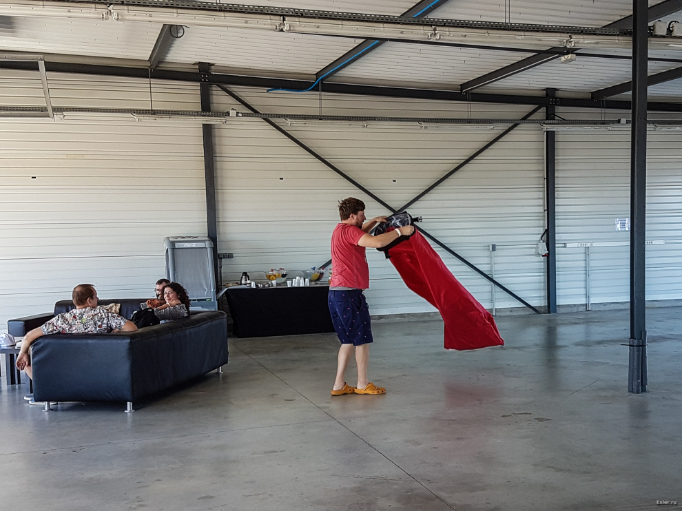 Пока остальные делают селфи с суперкарами, Илья Шатилин готовится устроиться в своем суперкресле. Эту штуку Huawei раздавала на недавней презентации и Илья ею так проникся, что все время таскал сверток с собой. А штука и правда очень прикольная. Упаковывается в небольшой сверток, легко помещающийся в рюкзачке. Достаешь, разворачиваешь, открываешь горловину, делаешь пару оборотов вокруг себя, чтобы внутрь попал воздух.