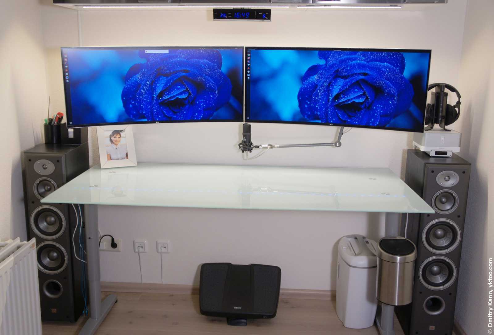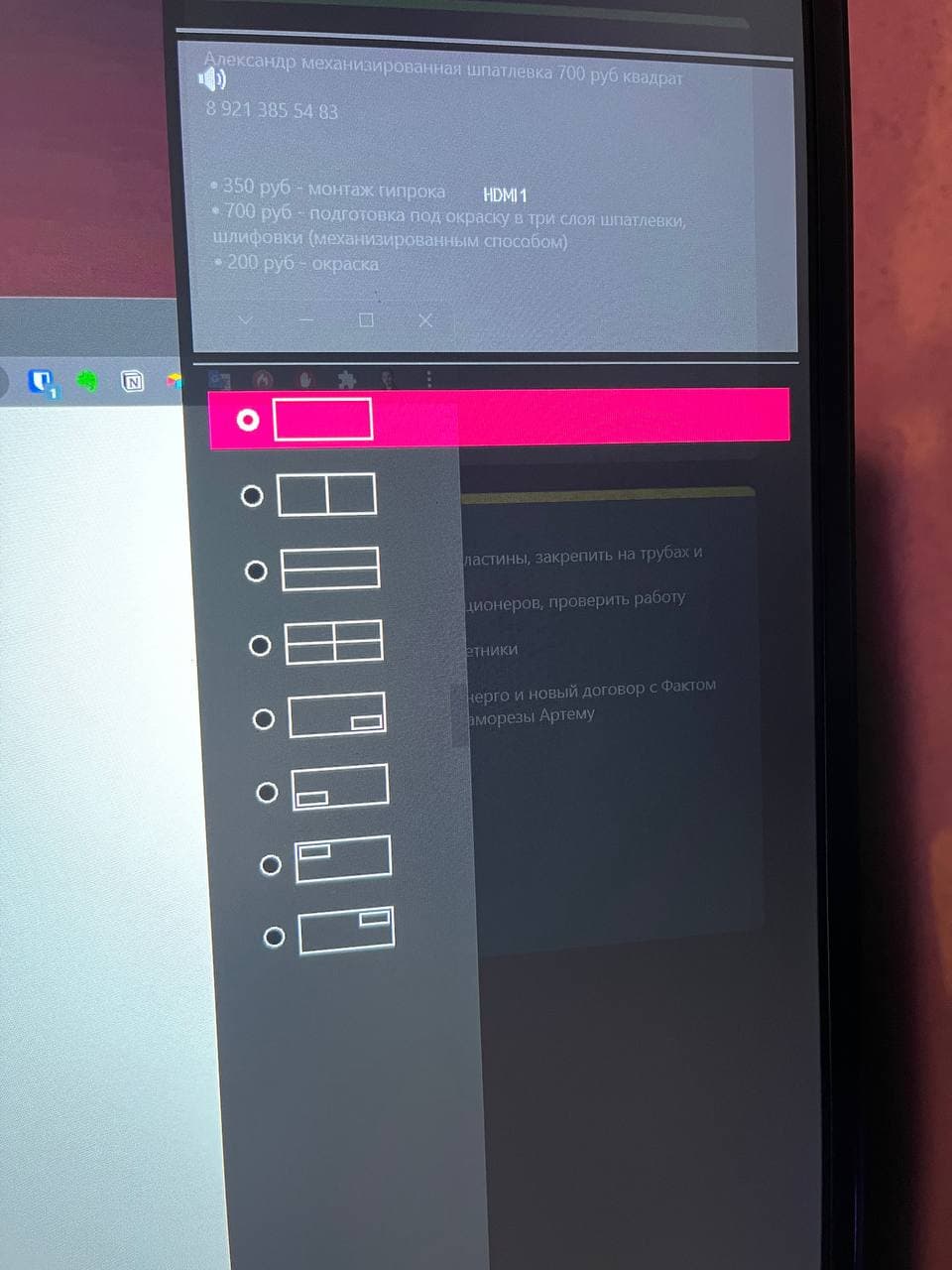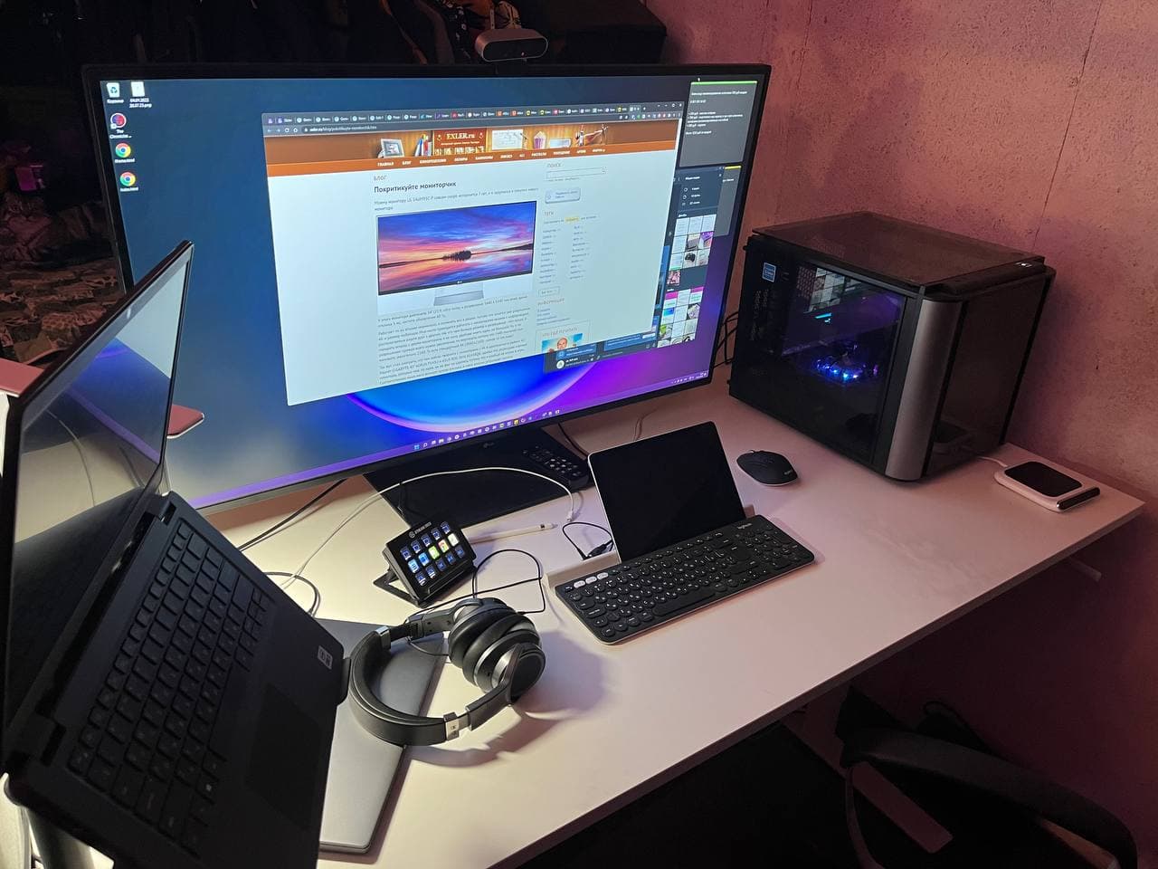 - Монитор для основной рабочей зоны перед глазами с хорошим экраном и яркостью - выполняются обычные рабочие задачи ( тут может быть что угодно, как созвоны/митинги, запись видео, чтобы камера смотрела в лицо, код и тд). Тут уже фокусировка, концентрация внимания, можно организовывать несколько workspace и быстро переключаться между ними, держа информацию на дополнительных мониторах неизменной. В профессиональном использовании тут уже у каждого свое применение.