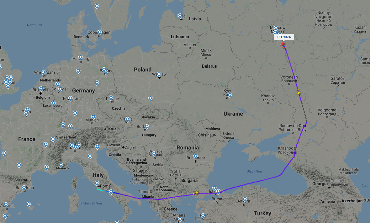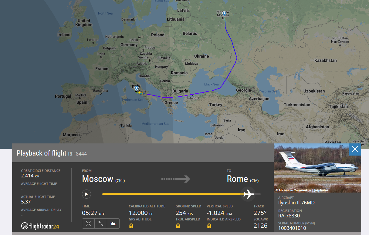 Путь российских самолетов в Италию оказался длиннее, чем ожидалось. Польша и Украина отказали в пролете над своей территорией. Самолеты направляются южным путем через Турцию, Албанию, Грецию с дозаправкой в Сочи.