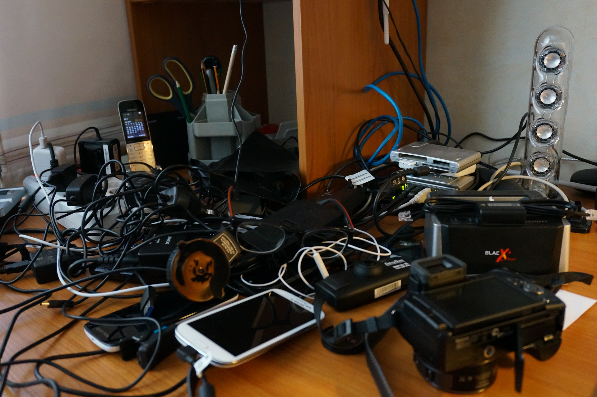 Завидую, черт!!! У меня вот практически тоже самое, только вместо гаджетов куча промышленного электронного хлама, а сверху в 12-00 все планомерно еще покрывается всякими бумагами, факсами, отчетами и пр. херотой... В результате найти проводочки уже практически становится офигенно непростой задачей 😄