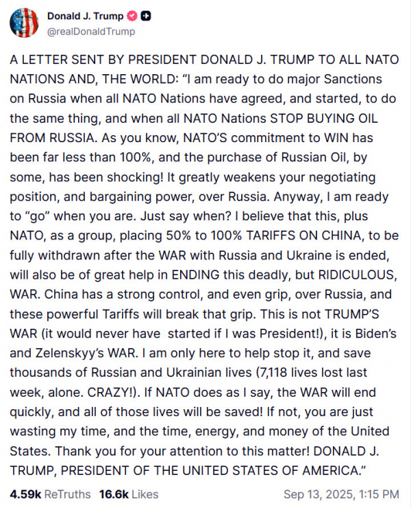 Вообще-то цель послания Трампа была в другом. Решил потроллить европейских гавриков, которые все время чего-то требуют от Америки, а сами жуют сопли и лицемерно продолжают покупать российскую нефть обходными путями.
