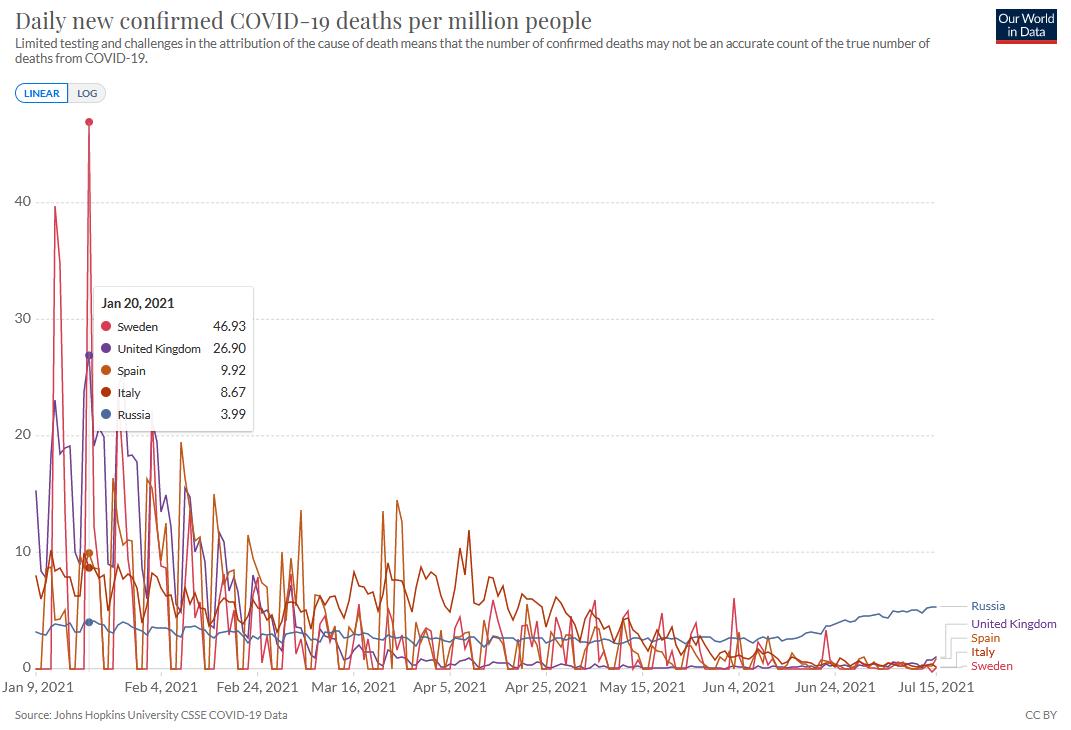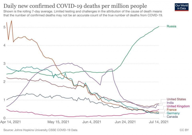 Ну а про "несколько месяцев назад", так тогда и вакцинации по сути ещё не было, она только последние 1,5-2 месяца ощутимый результат начала показывать. Речь-то именно о вакцинации. В странах, где привит большой процент населения, смертность с продвижением вакцинации падала и сейчас на очень низких значениях, а вот в России она выросла в 2 раза за месяц и уже давно побила собственный рекорд, поставленный зимой.