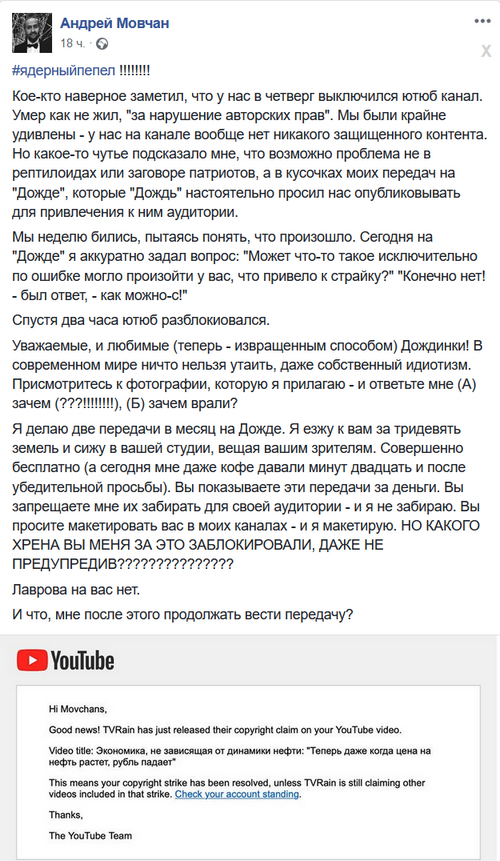 Сегодня в FB у Андрея Мовчана прочитал совершенно поразительную историю. Андрей ведет свой Youtube-канал Movchans. И этот канал был заблокирован за "нарушение копирайта". Андрей был в шоке: у него в канале - только его передачи. Никакого чужого контента у него нет. Но в еще большем шоке он был, когда выяснилось, что его канал был заблокирован по жалобе... телеканала "Дождь".