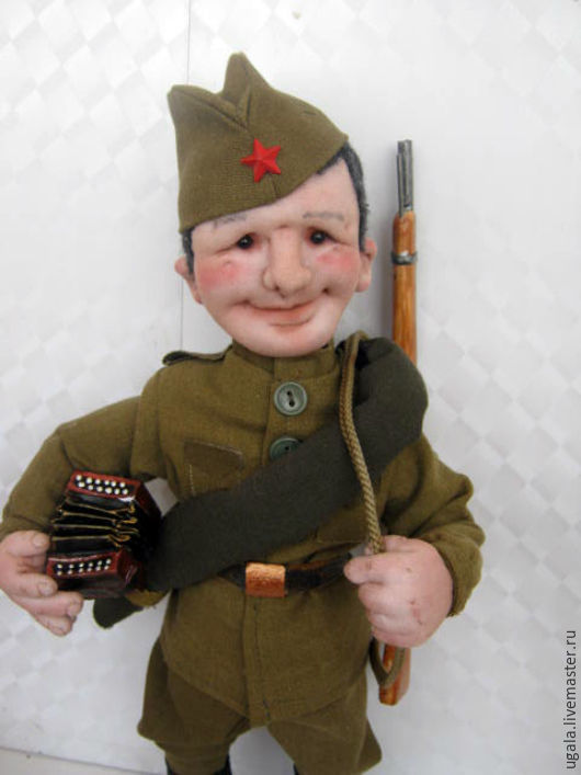 Мягкая кукла "Ветеран" торговой марки "Бока" стилизована под участника войны, одетого в соответствующую форму с пилоткой на голове. К груди приколота георгиевская лента - символ великой Победы. Игрушка сделана из приятного на ощупь, качественного текстиля. Кукла будет напоминать о подвигах наших дедов и способствовать повышению патриотического духа ребенка. (Отсюда.)
