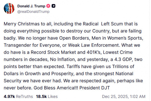 С Рождеством всех, включая радикальную левую шваль, которая делает все возможное, чтобы разрушить нашу страну, но терпит неудачу. У нас больше нет открытых границ, мужчин в женском спорте, трансгендеров для всех или слабого правопорядка. У нас есть рекордный фондовый рынок и пенсионные планы 401K, самый низкий уровень преступности за последние десятилетия, отсутствие инфляции, а вчера — ВВП 4,3%, что на два пункта выше ожидаемого. Тарифы принесли нам триллионы долларов роста и процветания, а также самую сильную национальную безопасность, которую мы когда-либо имели. Нас снова уважают, возможно, как никогда раньше. Боже, благослови Америку!!! Президент Д. Т.