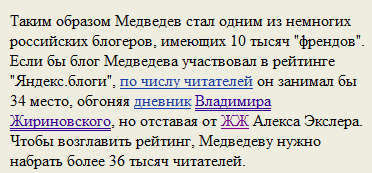 Думаю, за Медведева сидят "специально обученные". А самому Медведеву подгоняют сводочку. Он реагирует, это заливают в блог. Что такое "активный юзер интернета"? Я не ахти какой активный юзер, но у меня инет убивает массу времени. Не думаю, что Медведев может себе такое позволить. Хотя, несомненно, всем приятно, что Сам вроде как с ними.