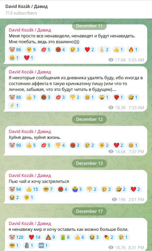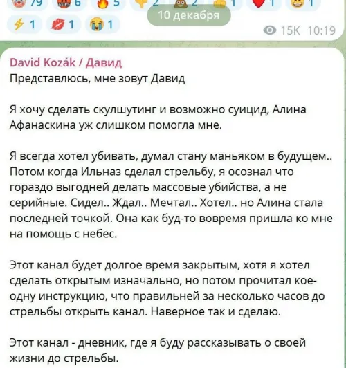 В Сети обнаружен русскоязычный Telegram-канал в котором автор готовится к шутингу. ФИО совпадают с предполагаемым стрелком в Праге. В мессенджере есть канал David Kozák, созданный 9 декабря, который велся на русском языке.