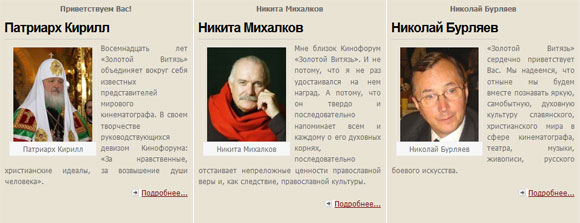 Причем заметьте, там на главной - так классно! Справа налево: Николай Бурляев, Николай Бурляев, Николай Бурляев. Потом Никита Михалков, Никита Михалков, Никита Михалков. А Патриарх Кирилл - всего два раза. Но зато "Приветствуем Вас" (традиционно безграмотно с большой буквы "вас"). Как-то непочтительно...