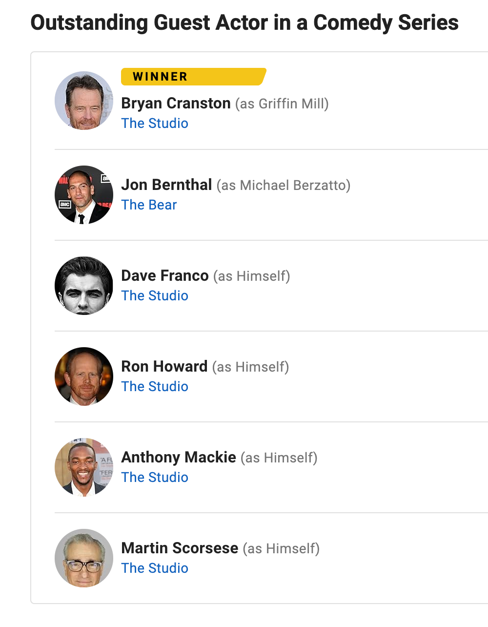 Сатирический сериал "Киностудия" получил за дебютный сезон в общей сложности 13 наград "Эмми", что стало новым рекордом для комедийного сериала. Сет Роген, сыгравший в нем недавно назначенного главу крупной киностудии, получил четыре статуэтки "Эмми" - как актер комедийного сериала, сценарист, режиссер комедийного сериала и продюсер. В сериале снялось множество звезд, которые играют самих себя в гостевых ролях, в том числе Мартин Скорсезе, Зак Эфрон и Шарлиз Терон. (Отсюда.)