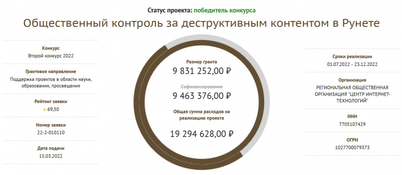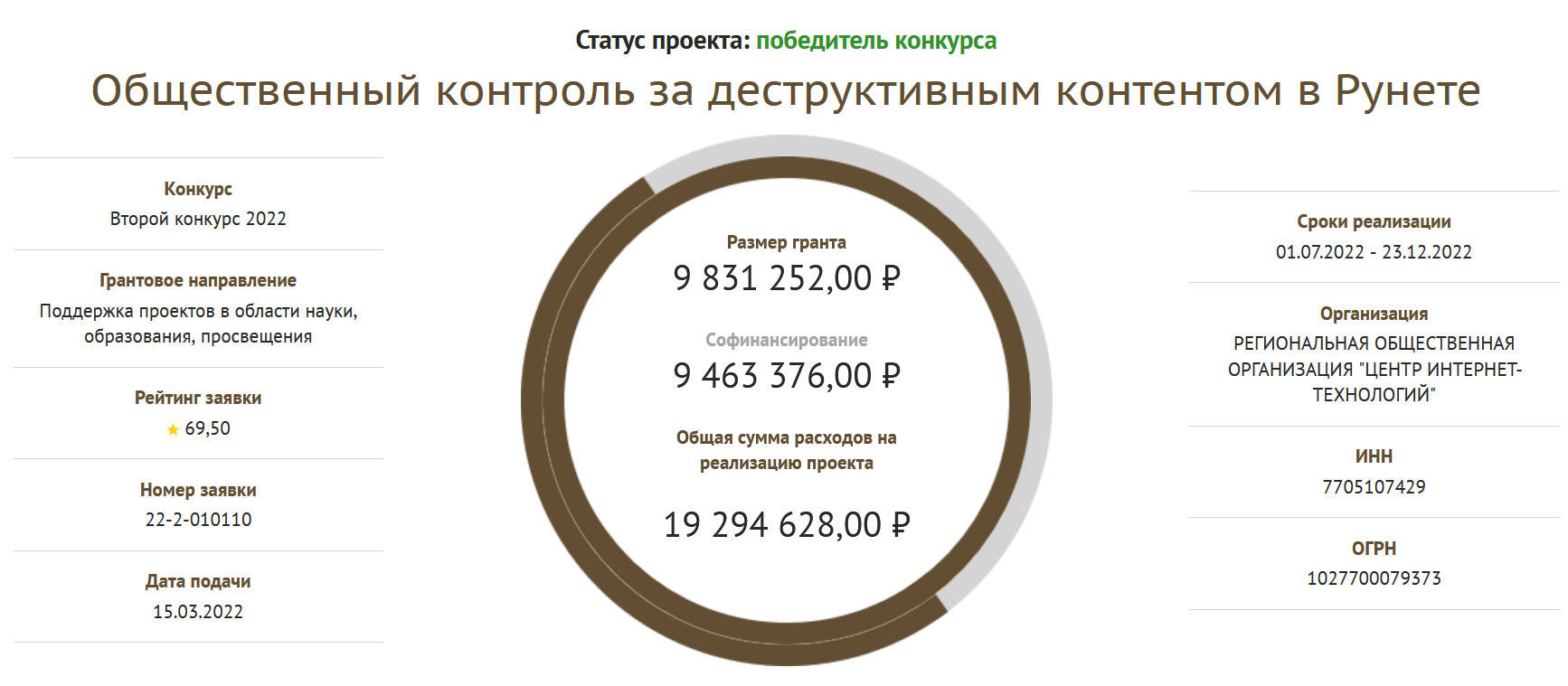 Кто там у нас в победителях? Ну, конечно, "РОЦИТ", где имперский айтишник Ашманов давно и вполне успешно пилит бюджетные бабки на "контроле за деструктивным контентом".