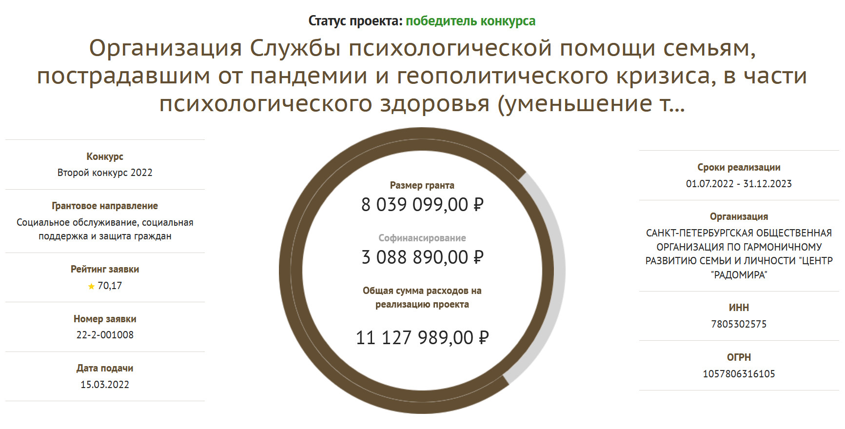 Помойка под названием "Центр Радомира" получила 8 миллионов. Они на каждом конкурсе неизменно выигрывают. Чем занимаются? Оказанием психологической помощи для людей, испытывающих, цитирую "стресс от геополитических событий, экономической блокады и геноцида, развязанного мировым сообществом против России и русскоговорящих людей, произошедшего на социально-политической почве разлада внутри семей, в кругу друзей, между поколениями, требует большей эмоционально-психологической устойчивости".