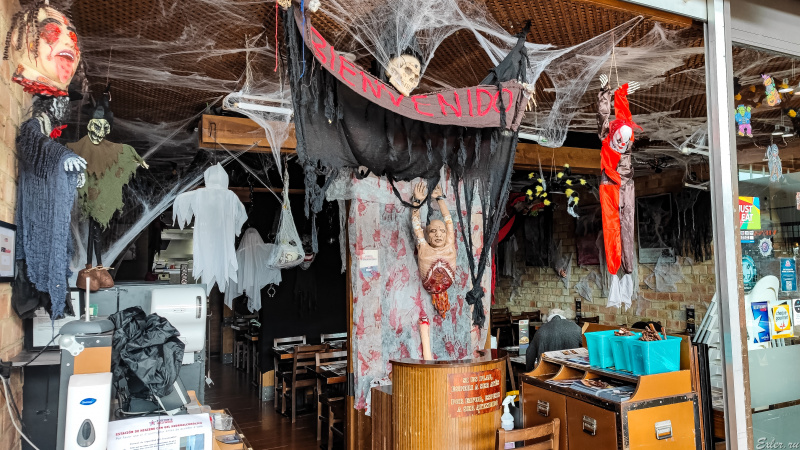 Многие заведения уже готовятся к Хэллоуину. Мы вчера ездили в "Матаро Парк" посмотреть на последнего в истории Джеймса Бонда (рецензия в четверг), после него решили пообедать в каком-нибудь местном ресторанчике.