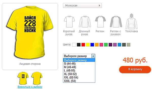 Щелкаете по ней, попадаете в раздел задания различных параметров: гендерная принадлежность (мужская, женская, детская), вид одежки (короткий рукав, длинный рукав, реглан, реглан с рукавом, полупердончик или пальто-палатка), цвет, размер и количество. Там же сразу видна цена - очень небольшая, уверяем вас, торгуем практически только из любви к искусству!
