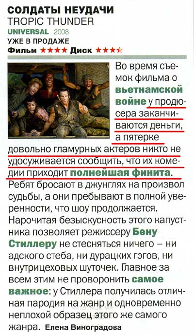 Totalfilm не читал, с Tropic Thunder они, конечно, оконфузились, и фраза про козлика точно дурацкая. Но о "Мамма Мия" впечатление приблизительно такое же 😄 - налет какой-то... безмозглости что-ли... Какая ни была бы комедь-раскомедь, то бишь развлекуха, должно быть в ней что-то и для мозга... такое вот субъективное ощущение.