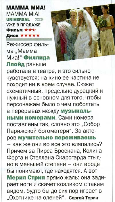 ... "Мамма Мия" впечатление приблизительно такое же - налет какой-то... безмозглости что-ли... Какая ни была бы комедь-раскомедь, то бишь развлекуха, должно быть в ней что-то и для мозга... такое вот субъективное ощущение.