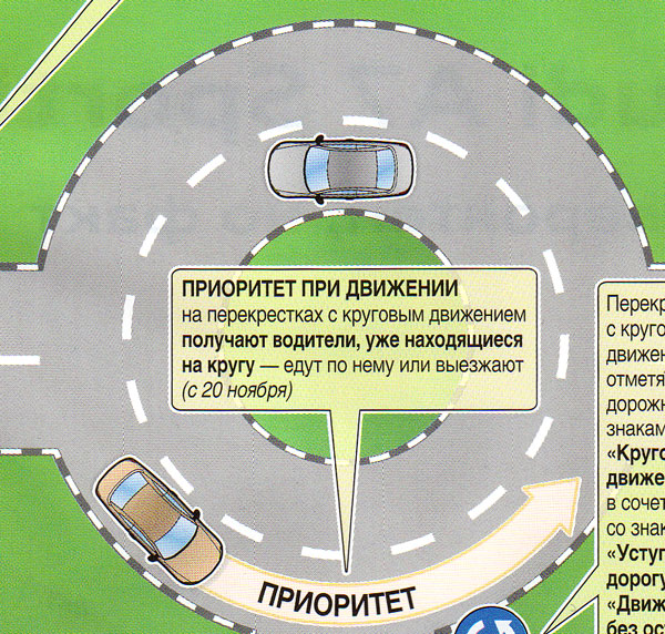 Сейчас приоритет имеет въезжающий на круг, а после вступления поправок в силу "главными" станут водители, которые уже находятся на кругу - едут по нему или выезжают, но это относится только к перекресткам с круговым движением, при подъезде к которым будут установлены дорожные знаки "Круговое движение" в сочетании со знаком "Уступите дорогу" или "Движение без остановки запрещено". Чтобы водители не путались, когда круг "главный", а когда нет, необходимо внимательно смотреть на установленные знаки. При въезде на круг, который является "главным", перед ним в обязательном порядке будут устанавливаться дорожные знаки "Круговое движение" в сочетании со знаком "Уступите дорогу" или "Движение без остановки запрещено".