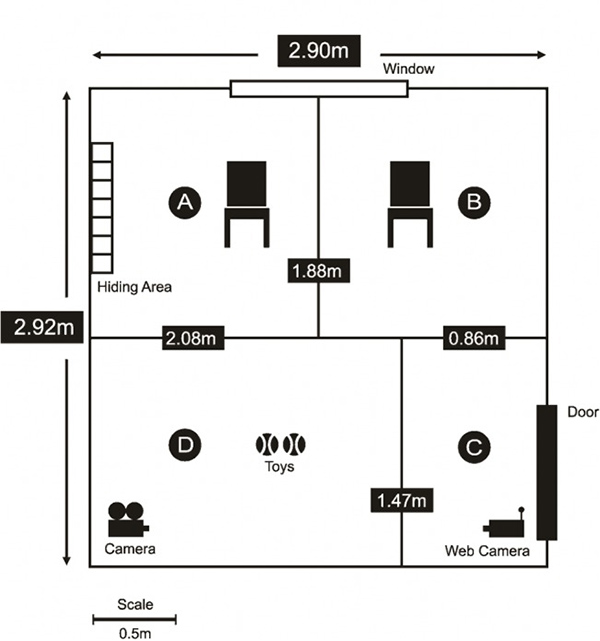 Графическое изображение планировки и размеров испытательных комнат (1) и (2). Каждая комната была разделена на четыре зоны: A) хозяин/посторонний, B) хозяин/посторонний, C) дверь, D) игра.
