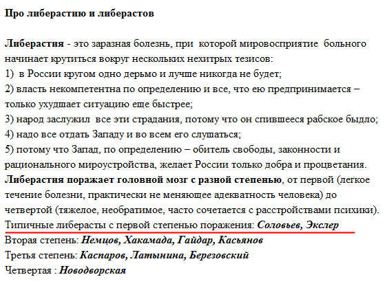Ну вот как раз про Соловьева все понятно, политически ангажированная личность, просто автор не разобравшись приписал его к либерастам. Соловьев обидется.