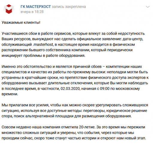 У одного из первых рунетовских хостинг-провайдеров и регистраторов доменов "Мастерхоста" - большие проблемы. Соответственно, огромные проблемы наблюдаются у пользователей "Мастерхоста", которые держат у этого провайдера свои серверы и сайты. Как я читал, сбои стали проявляться еще с 28 февраля, а 2 марта полегло просто ВСЕ, включая сайт "Мастерхоста", который перестал открываться. Как пишут пользователи, служба поддержки или не отвечает, или отвечает стандартными отписками, или и вовсе хамит по телефону. На странице "Мастерхоста" в VK написано, что, оказывается, бывший собственник захватил дата-центр и, цитирую, периодически инициирует проблемы в работе оборудования - видимо, бегает по дата-центру и отключает серверы.