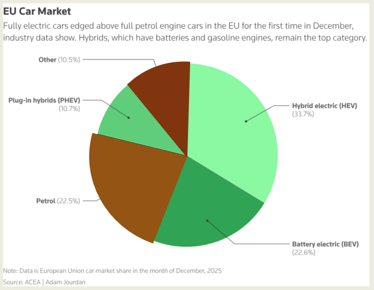 В Reuters пишут, что продажи полностью электрических автомобилей впервые превысили продажи автомобилей, работающих только на бензине - это данные по ЕС за декабрь. Однако наибольшую долю рынка занимают гибриды.