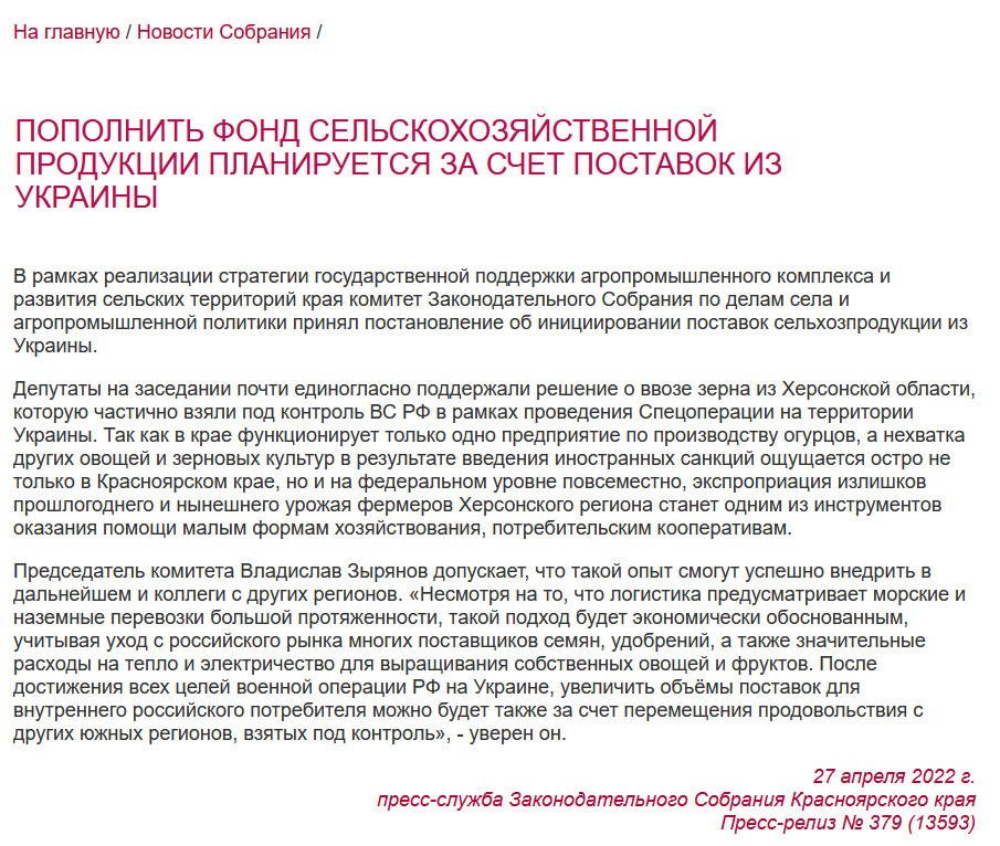 «Депутаты на заседании почти единогласно поддержали решение о ввозе зерна из Херсонской области, которую частично взяли под контроль ВС РФ в рамках проведения Спецоперации на территории Украины. Так как в крае функционирует только одно предприятие по производству огурцов, а нехватка других овощей и зерновых культур в результате введения иностранных санкций ощущается остро не только в Красноярском крае, но и на федеральном уровне повсеместно, экспроприация <...> станет одним из инструментов оказания помощи малым формам хозяйствования, потребительским кооперативам», — говорится на официальном портале парламента. (Отсюда.)