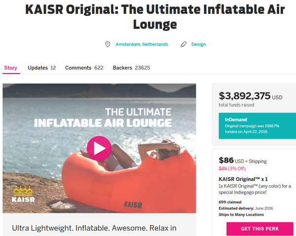 Что делаем дальше? Идем на какой-нибудь краудфандинговый сайт - "Кикстартер" или Indiegogo, без разницы - и там объявляем о сборе средств на невероятно новую, оригинальную и инновационную штуку, которую назовем, например, KAISR Original: The Ultimate Inflatable Air Lounge. Да-да, ребята, у нас родилась гениальная мысль: сделать такую маленькую, легкую, переносную кроватку, которую надул - и балдей себе где-нибудь на бережочке. Поэтому подайте денежек, кто сколько сможет. Ну, чтобы поддержать инноваторов.