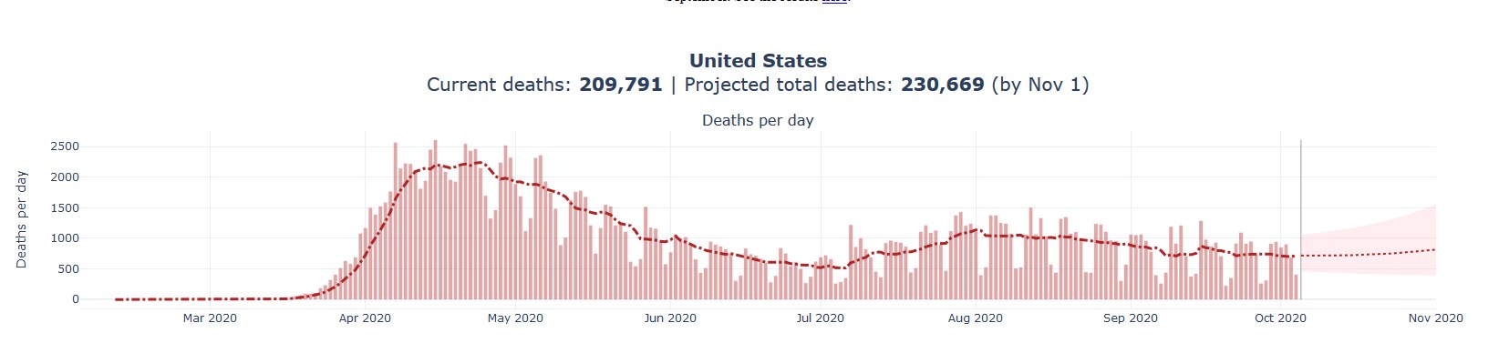 Projected Total: 230,700 deaths by Nov 1, 2020 (Range: 221-245k)