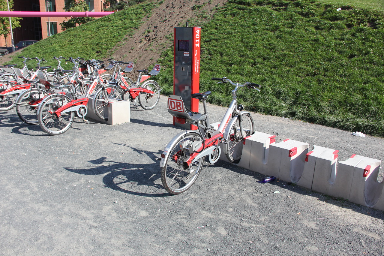 Общественные велосипедики. Во многих городах Европы такие есть. Очень удобно: в любом месте взял, в любом месте оставил. Можно постоянно арендовать - даже на месяц стоит копейки. Правда, обычно доступно только местным.