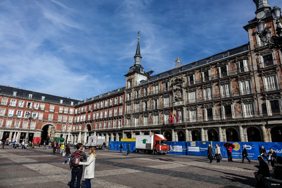 А мы нашу прогулку начали с главной площади Мадрида - Plaza Mayor, что в переводе, как ни странно, и означает - Главная площадь. Начали строить ее в 1617 году: на этой площади располагался главный в городе рынок, также тут проводились турниры, церемонии, коррида и сжигание еретиков - в общем было весело.