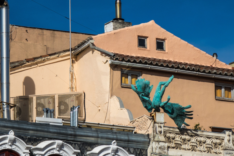 Падший ангел. Воткнулся прям башкой. Что интересно, это творчество жителей данного дома. Им так захотелось: чтобы об их дом затормозил падший ангел.