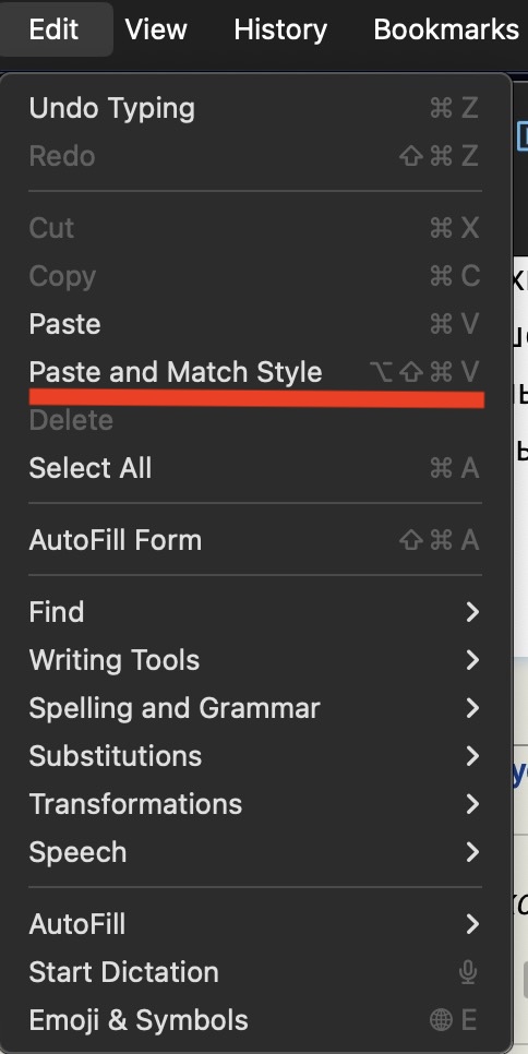 Либо через верхнее меню Edit / Paste and match style.