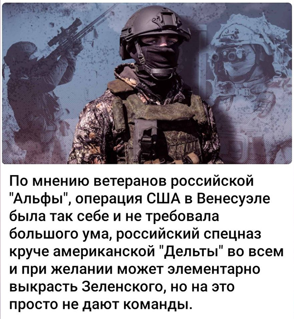 "У издания Daily Storm вышел крайне особенный взгляд двух ветеранов спецподразделения "Альфа" на проведенную США операцию по похищению Мадуро. Приводим материал как есть для ознакомления с тем, через какую искаженную призму на происходящее смотрят отдельные высокопоставленные представители российских спецслужб".