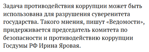 Она и вправду права. Были и есть государства, существующие благодаря коррупции и скрепляемые этой коррупцией (самый яркий пример - Османская империя, где без подношений вообще ничего не происходило). Современная РФ из их числа - чиновники живут благодаря коррупции, начальство контролирует подчиненных с помощью коррупции (на каждого есть досье), все функции государства направленны на поддержание и защиту коррупции от самого низа до президента. Если коррупцию уничтожить, то чиновникам не на что будет жить (на зарплату в несколько сот тысяч рублей в месяц? Вы смеетесь?!), начальство не сможет контролировать подчиненных (чем заставить их явно нарушать закон, если нет узды и страха быть посаженым в случае ослушания?), государству тоже будет непонятно что делать и зачем существовать (защищать права простых граждан и делать их жизнь лучше оно не умеет). Так что да: не будет коррупции - не будет теперешнего российского государства. Будет другое, но таким как Яровая там точно не будет места. Эх, поскорее бы!