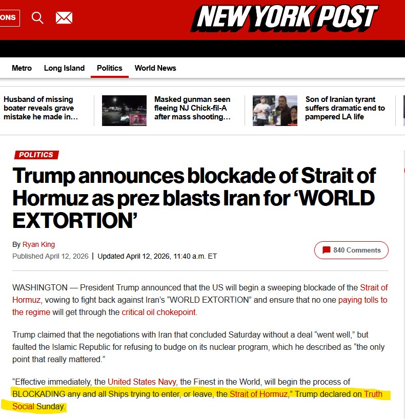 В своем первом посте в Truth Social, в котором он объявил о блокаде, Трамп написал, что ВМС США получили приказ останавливать суда, уплачивающие Ирану то, что он охарактеризовал как незаконные сборы.