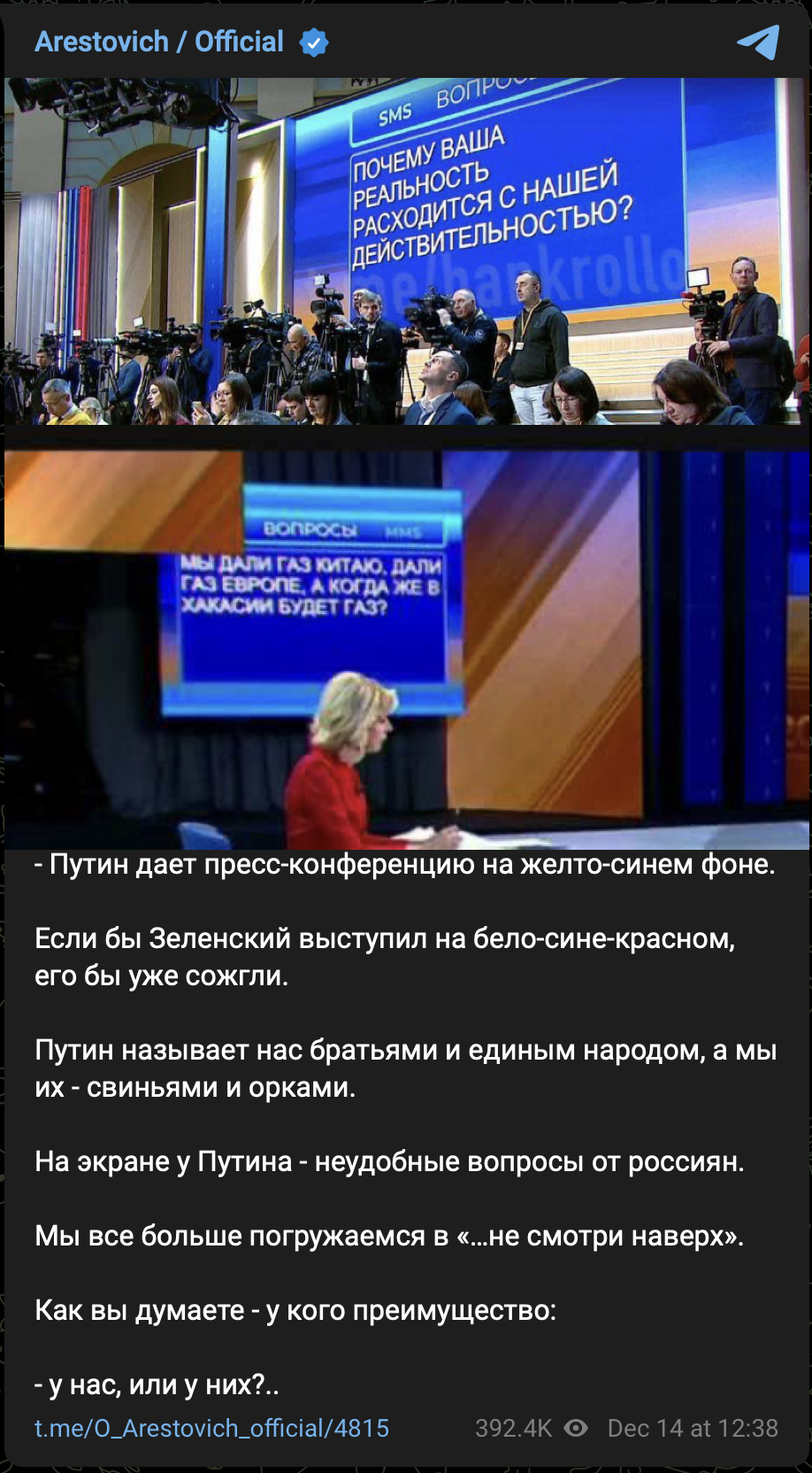 ЗЫ Я не любитель Арестовича, если что, но я и не любитель навешивания ярлыков и оценки говорящего по ним. Я оцениваю не личность, а то, что она говорит. А то, что говорит сейчас Арестович, на мой взгляд, очень для Украины актуально.
