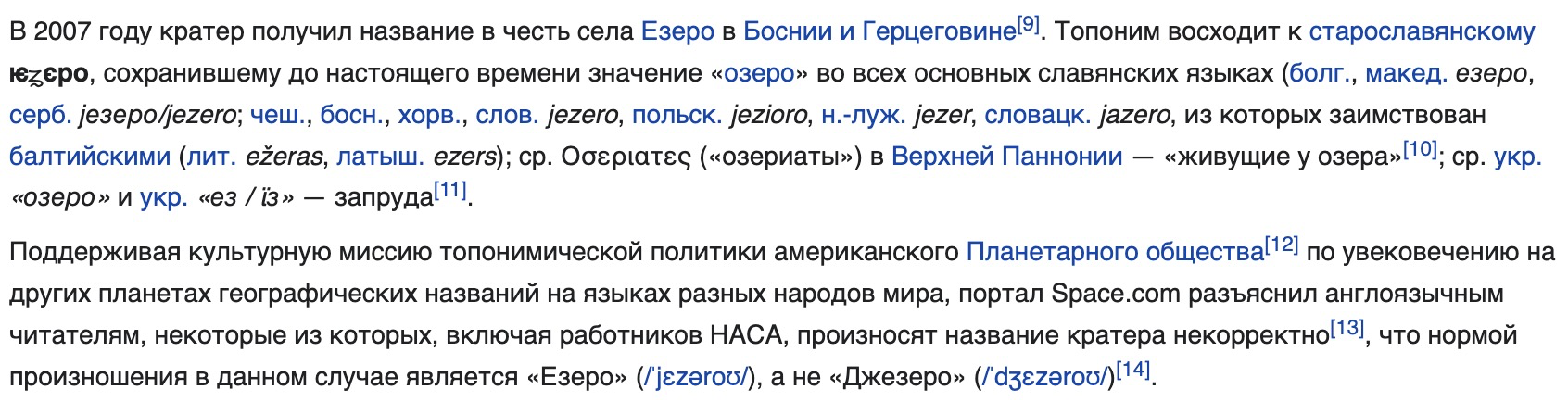 "Поддерживая культурную миссию топонимической политики американского Планетарного общества[12] по увековечению на других планетах географических названий на языках разных народов мира, портал Space.com разъяснил англоязычным читателям, некоторые из которых, включая работников НАСА, произносят название кратера некорректно[13], что нормой произношения в данном случае является «Езеро» (/ˈjɛzəroʊ/), а не «Джезеро» (/ˈdʒɛzəroʊ/)[14]".