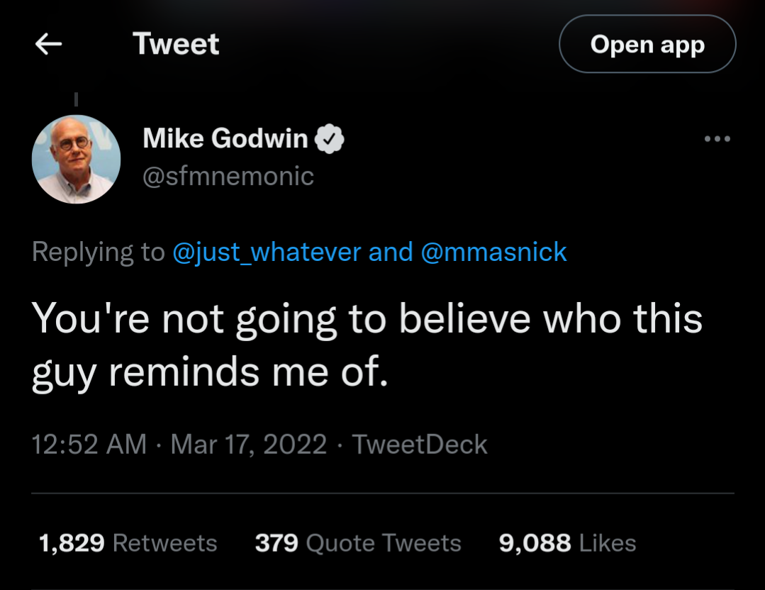 Закон ГодвинаПо мере разрастания дискуссии в Usenet вероятность сравнения, упоминающего нацизм или Гитлера, стремится к единице[1].