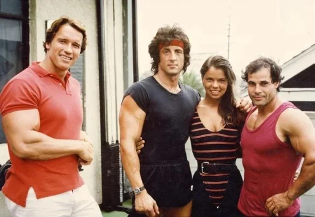 Нашел фото. Арнольд Шварценеггер, Сильвестр Сталлоне, Негрита Джейд и Франко Коломбо (бывший Мистер Олимпия), тренировка на пляже Венис, 1980-е годы.